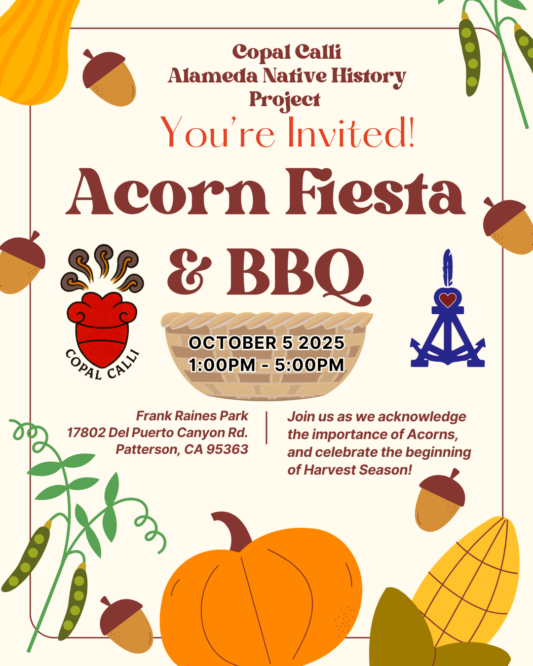 Copal Calli, which empowers the 209 community through education, cultural awareness, leadership, and healing, is partnering with Alameda Native History Project to create this intercultural gathering. Together, the two organizations are bringing people together to celebrate Indigenous foodways and shared traditions.