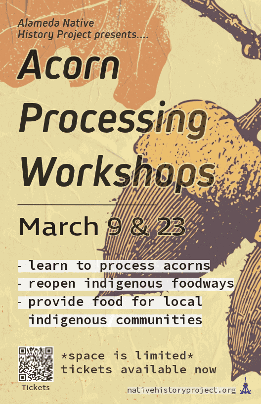 Production workshops will be focused on producing the Acorn Flour and Acorn Meal we’ll actually offer and distribute to Indigenous Communities, and the Muwekma Ohlone Tribe of the San Francisco Bay Area.