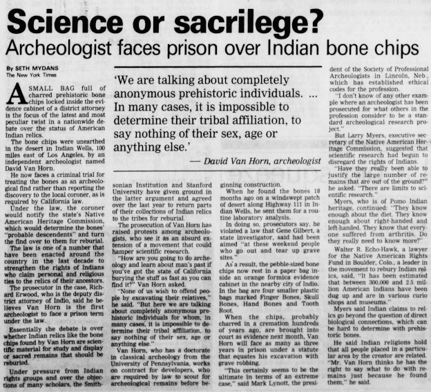 Van Horn publicly showed contempt for NAGPRA, and claimed he was being unfairly persecuted for doing legitimate, scientific, work. He even went as far as to throw doubt that the representatives of several Native American tribes demanding return of these objects were even related to the bodies discovered.